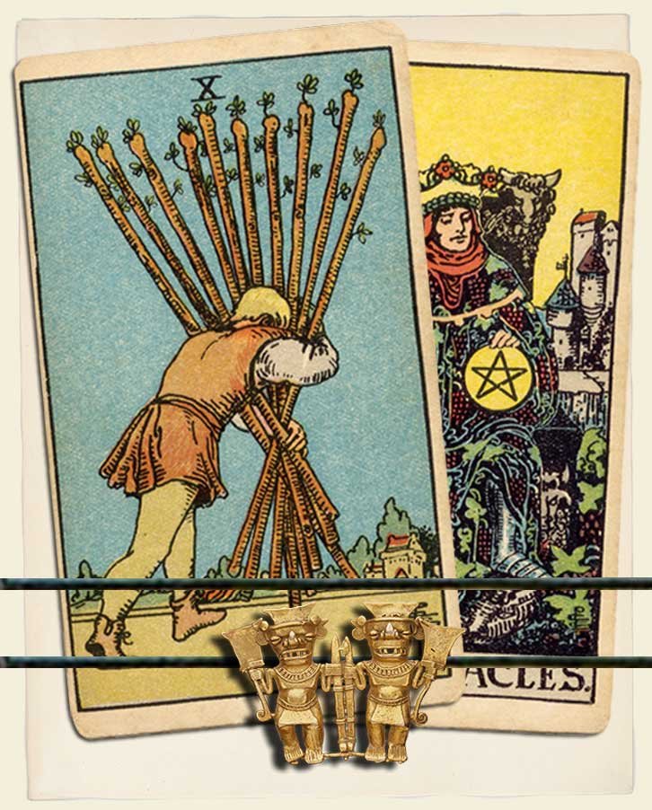Ten of wands and King of pentacles tarot combination means that two mystic forces: 1) Responsibility and 2) Prosperity guide your decisions today. If you keep putting your life on the line, you are going to be let down unless you start to think of reasons why it is a good idea to apply a little thought to your actions. Success comes from the fine ironing out of creases, and the responsibility of seeing goals through. Make each one count, because eventually they will add up to a beautiful set of circumstances. All yours for the taking.