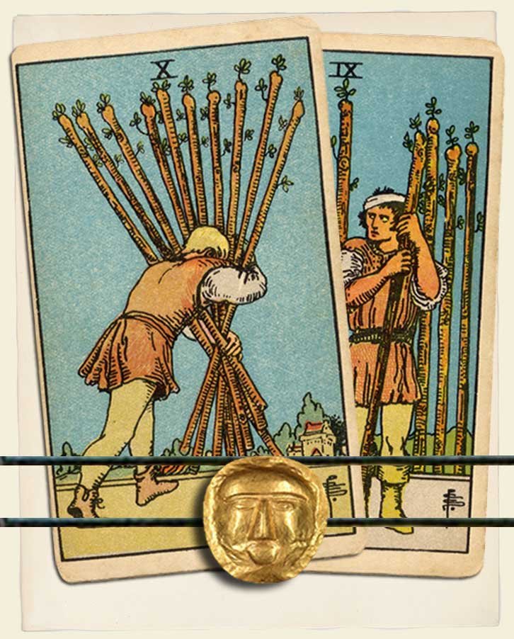 Ten of wands and Nine of wands tarot combination gives a glimpse into your medium-term future, which will come to pass from the combined effect of (A) Burden (effect of Ten of wands) and (B) Test Of Faith (effect of Nine of wands). In other words, it means that there are not a lot of tarot combinations where it would be good advice to recommend you continue carrying this overwhelming load that the Ten of Wands has burdened you with, but when we find it with the Nine of that same suit, it is time to take a breath and push on. You will make it. All you have to do is believe. As hard as this may be, as tough as it seems, you can do this. Carry on.