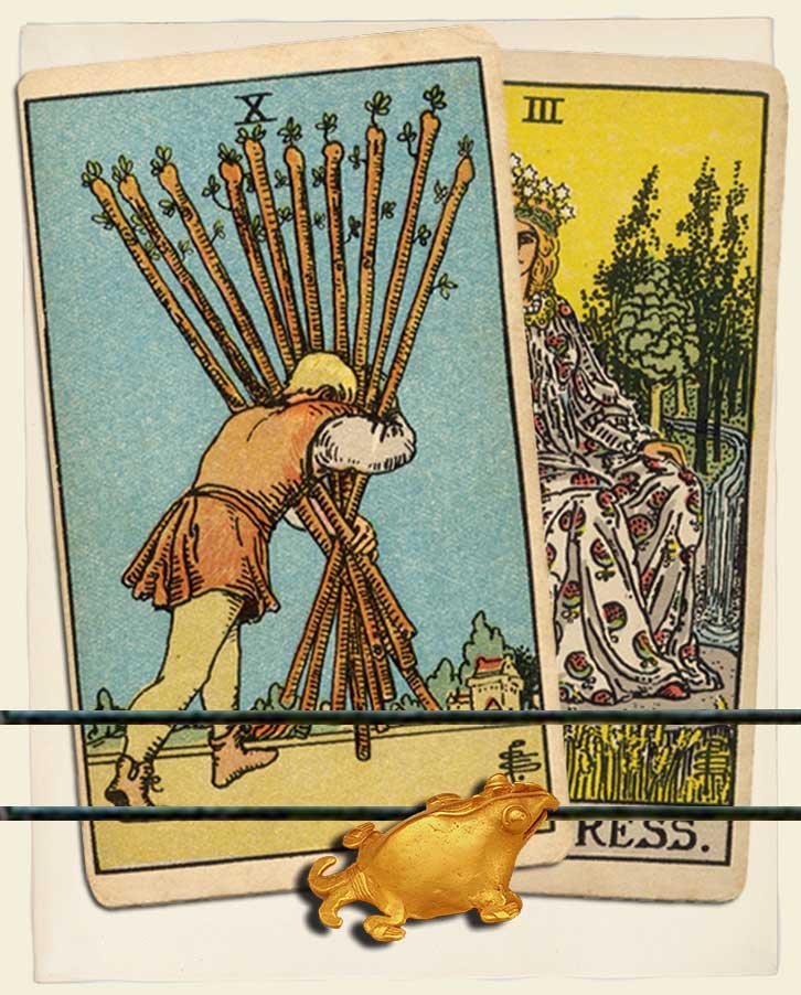 Ten of wands and The Empress combination means that two arcane forces: 1) Burden and 2) Sensuality have influence on you today. You see your body as something that simply exists, rather than using it to your advantage. This could be due to the fear of letting yourself go, or sensing that low -self-esteem creeping back in from your past. Our memories can sometimes weigh us down, but they should never prevent us from loving ourselves and the bodies we blessed with.