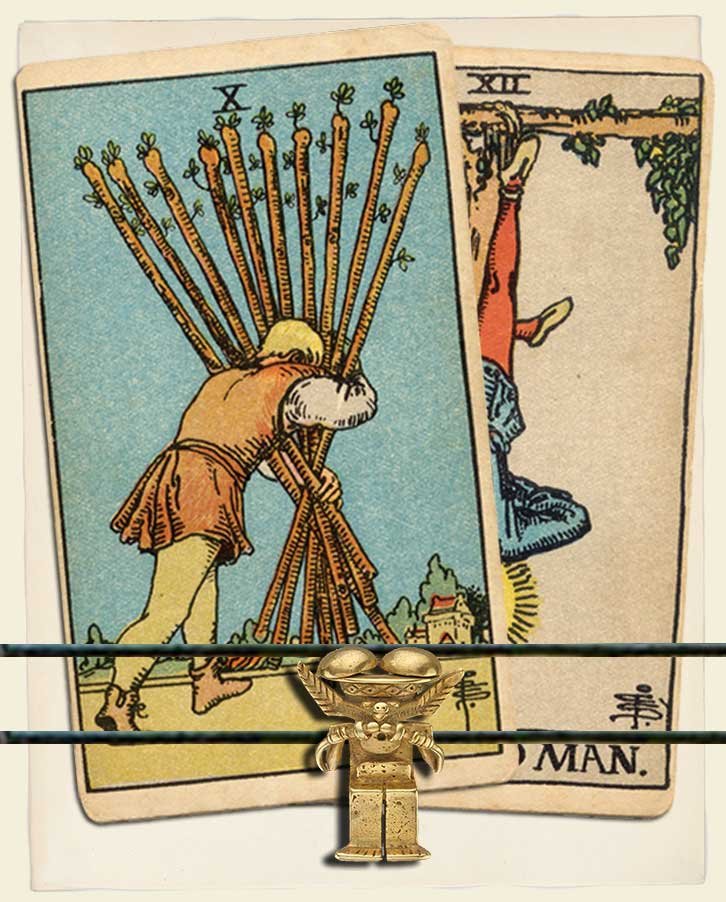 The combination of Ten of Wands and The Hanged Man in love and relationships is not a favorable one. It signifies stress, burnout, overwhelm, necessary sacrifice, and the need to let go of past hurt.