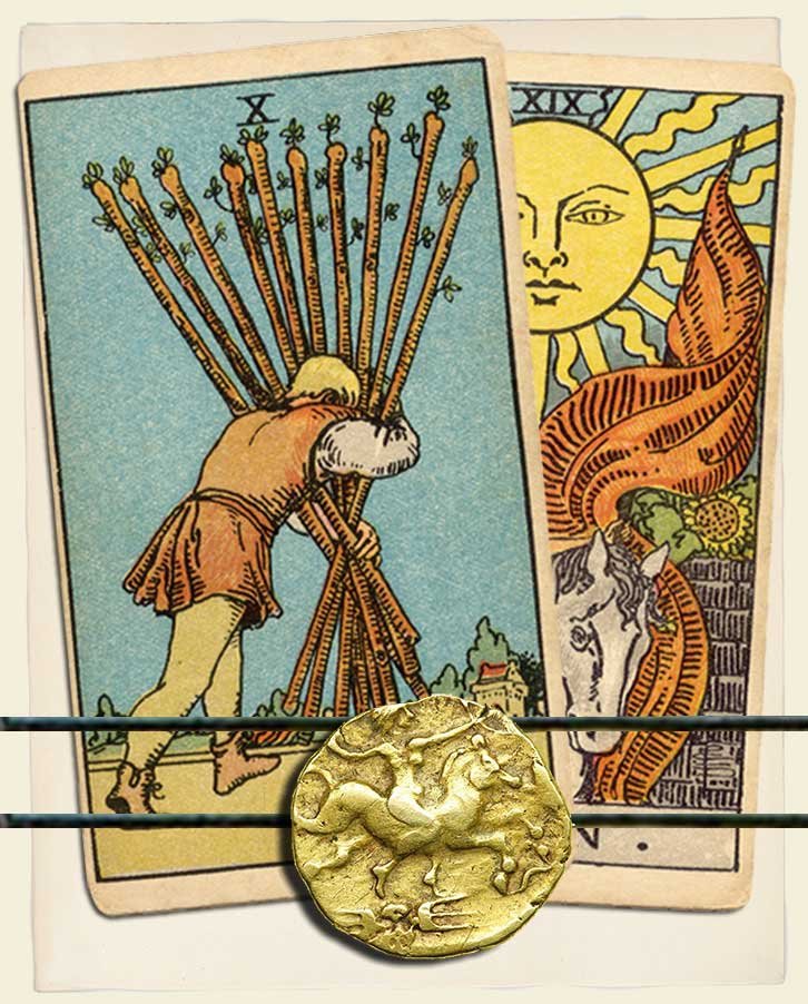Ten of wands and The Sun tarot combination means that two tarot effects: 1) obligation and 2) vitality together are exerting influence on you. In other words, it means that you have what it takes to cross the finish line. You’ve taken on a heavy burden that might crush someone with a weaker constitution, however, you have the energy within you to accomplish great things. You’ve learned that you work well under pressure and that the satisfaction of a job well done drives you on. Other substantial rewards are sure to follow when others recognize the virtue of your work.