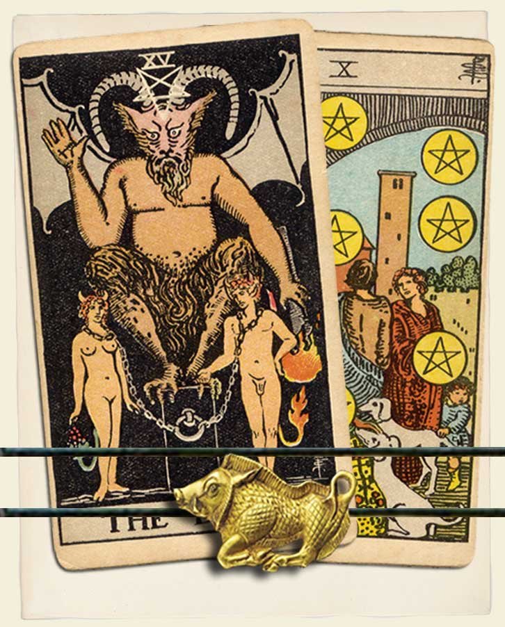 The Devil clarified by Ten of pentacles gives an insight into your immediate future. It will come about from the influences of (1) excess (effect of The Devil) and (2) roots (effect of Ten of pentacles). To put it differently, it indicates that you may need to begin exercising moderation in some aspect of your home or family life. What’s the advice of this pair? The Devil card points towards the unhealthy parts of your life. It is a card of excess and addiction and is a sign that you need to dial something back. The Ten of pentacles represents something stable and supportive in your life that grounds you (usually a home and family). Whatever The Devil represents is attacking these roots. It’s time to look at the ways in which you are out of balance and begin devising ways to restore equilibrium.