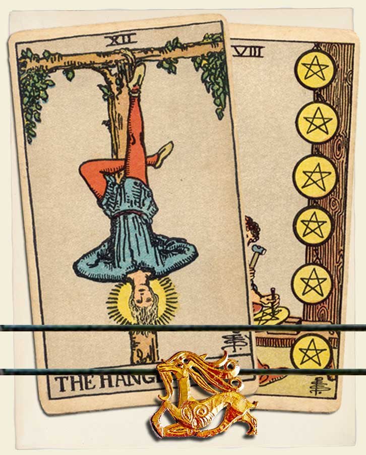 The Hanged Man and Eight of pentacles combination means that arcane tarot forces: 1) Surrender and 2) Apprenticeship are jointly affecting you today. How to interpret this tarot combination in practice? The way you work and the way you live go hand in hand. Sudden inspiration to connect your work to your calling is in the air. Don’t quit your job just yet. Remember, that small changes lead to significant outcomes. Set intentions behind your actions. Follow the path for a journey that is truly your own. Who knows who you will meet along the way?