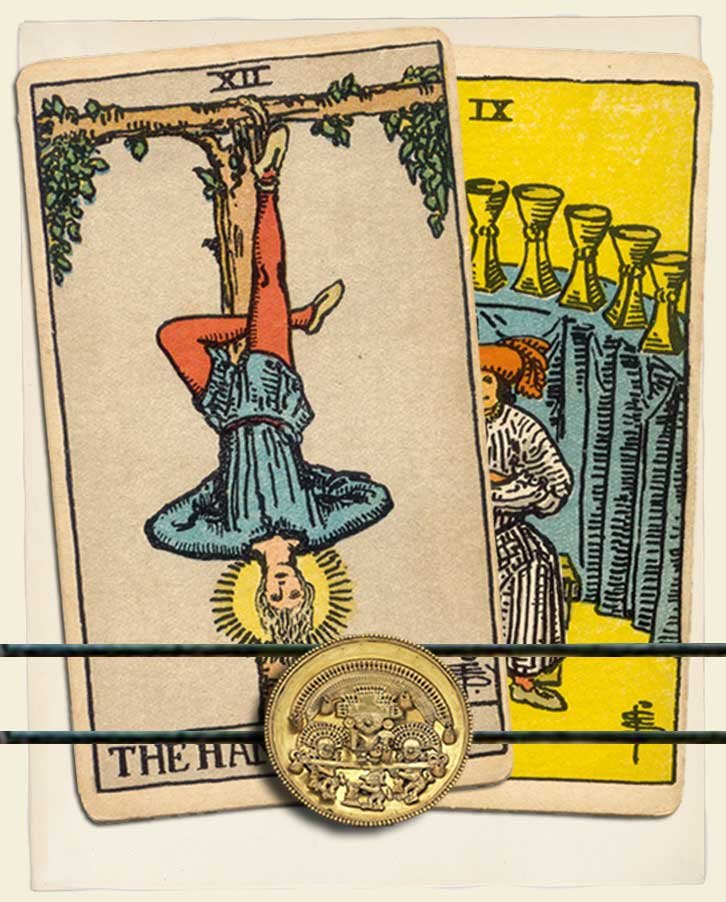 The Hanged Man and Nine of cups combination indicates that two tarot influences: 1) Perspective and 2) Success are effecting your person at this moment. What does it mean? Comparing yourself to others is becoming detrimental to your self-development. By comparing your accomplishments with the success of others, you run the risk of comparing chapter twenty in their success story to chapter one in yours. This perspective only generates unhappiness, so the time has come to adjust your outlook. Stop getting lost in the pages of other people’s success stories and start concentrating on writing your own.