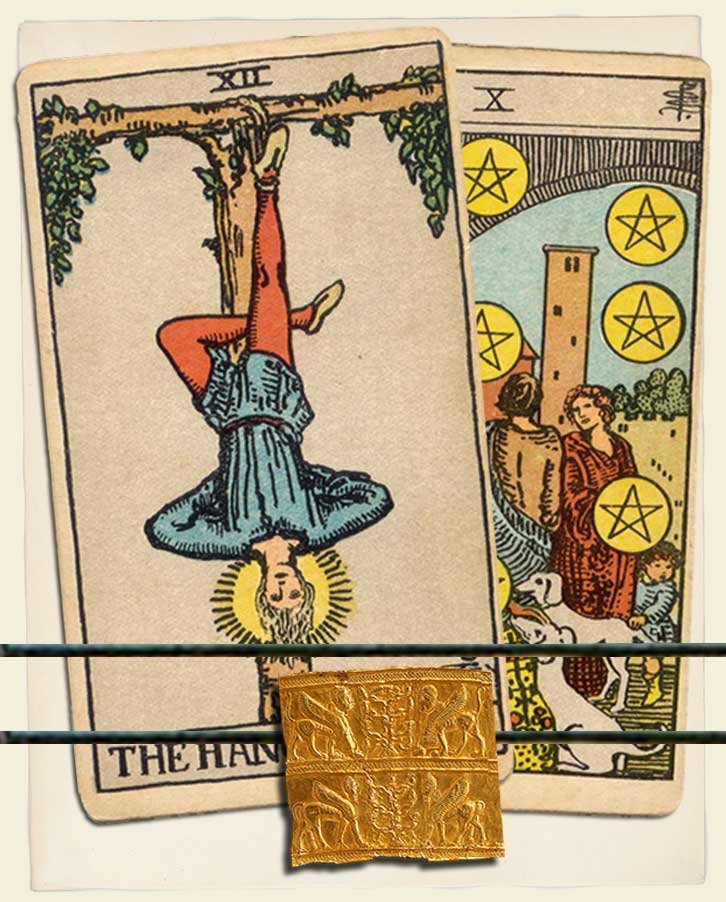 The Hanged Man and Ten of pentacles combination gives a hint about your prevailing state and close future, which will arise from the combined effect of: (I) Contemplation (arcane effect of The Hanged Man) and (II) Roots (effect of Ten of pentacles). To put it differently, these two cards appear together in a reading to indicate that someone is at a crossroads in their life, trying to decide what is best for them. If you are facing a similar situation, consider all of your options carefully. You have a lot to lose if you make the wrong decision, but you also have a lot to gain if you make the right one. The Ten of pentacles suggests that you should meditate on your family and your legacy before you make a choice. Bonne chance.