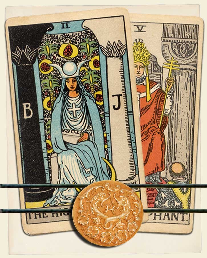 The High Priestess and The Hierophant tarot combination indicates that arcane tarot forces: 1) Divine Feminine and 2) Conformity have influence on you at this moment. Your inner illumination is outshining the life that currently surrounds you. As much as you try to conform to that of your peers and coworkers, you are finding it difficult to feel understood. Seek out likeminded creatives who spark your sense of spirituality and intuition. While taking a step away from your traditional community is scary, it will no doubt lead to higher wisdom. Seek out a mentor during this time.