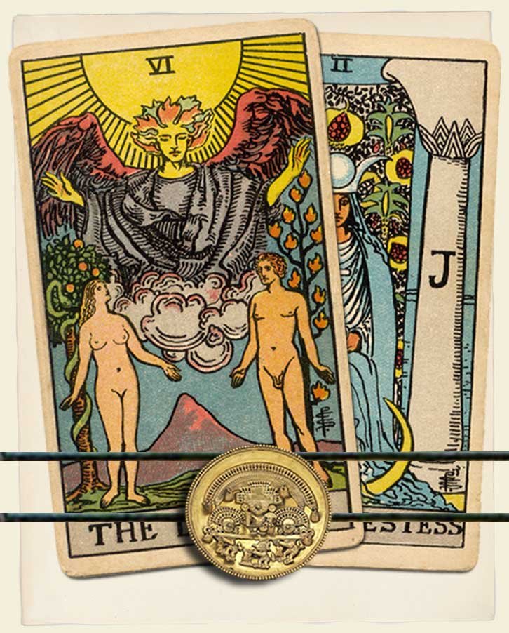 The Lovers and The High Priestess combination gives a glimpse into your near future. It is directed by the guiding influences of (1) HARMONY and (2) INNER VOICE (effect of The High Priestess). When this pair appears there is a lot of dreaming of love and intuition occurring at this time. This combination shows that an unexpected love or union will be coming in soon. It also encourages the union to follow their inner voice to be able to fulfill hopes and dreams for the relationship.