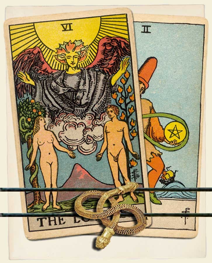 The Lovers and Two of pentacles together gives you intuition about a significant event in your future. It is influenced by the tarot forces of (I) Unions (from The Lovers) and (II) Resourcefulness. Both the Lovers card and the 2 represent balance, union and embracing differences for a greater whole. Today is the perfect day to appreciate what you have and to take note of the fabulous resources that you have all around you. The person you need is right in front of you.