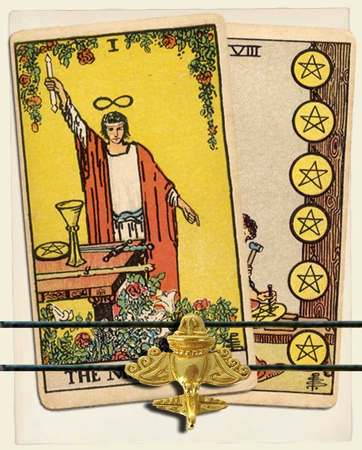 The Magician and Eight of pentacles cards together – what do they mean? The eight of pentacles asks you to focus and stay on track while the magician gives you the power to do so. You know what you will need to do to accomplish your goals. It is time to focus on what needs to be done. You are the one with the power to create the life you want. You will only be satisfied if you take charge of your future and work to achieve your goals. Use the power you have to direct your energy and focus to the most important tasks.