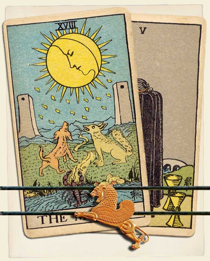 The Moon clarified by Five of cups provides an insight into your near future, which is directed by the guiding influences of (A) UNCERTAINTY and (B) SADNESS (as clarified by Five of cups). These cards in combination each enjoy the darkness, with The Moon wanting to show how bright things can be. It is in sadness we truly appreciate happier times, but it is the staying in the sadness that prevents happiness from finding us again.
