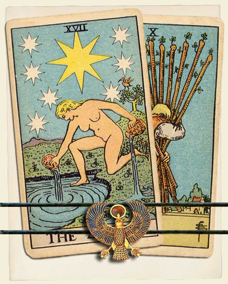 The Star and Ten of wands tarot combination gives a hint about your distant and barely discernible future. It will come to pass from the combined effect of (1) Hope (effect of The Star) and (2) Burning Out (effect of Ten of wands). This is not the time to give up on your love interest. The feelings you have for them have not yet been returned, but your love is about to bear fruit. You will soon be able to see them return your affections. This love was worth waiting for – as you will soon see.