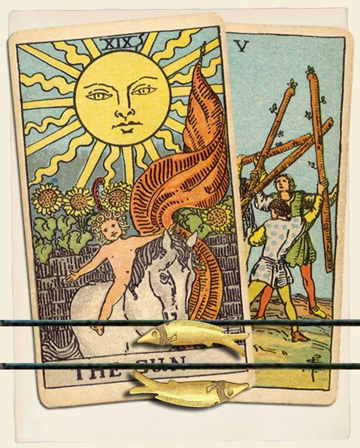 The Sun and Five of wands combination gives a hint about a situation in your future, which is directed by the guiding influences of (A) Vitality and (B) Conflict. These cards in combination only come together when there is a warning of being too childlike when faced with conflict. Barriers don’t always need to be up, and conflict can be resolved calmly and in an adult manner. You should try it sometime.