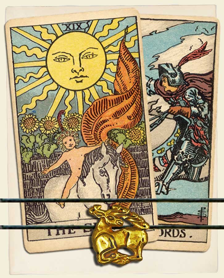 The Sun and Knight of swords tarot combination provides an insight into your current state and immediate future, which is influenced by the tarot forces of (I) FUN (from The Sun) and (II) ASSERTIVE (from Knight of swords). Those two cards like to shake things up with their zest for life and quick thinking. Your confidence can draw people to you, or push people away. You need to find the happy balance to keep friends and lovers.