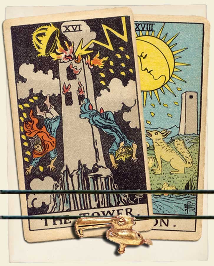 The Tower and The Moon combination provides an insight into your near future, which is influenced by the arcane forces of (1) REVELATION and (2) INTUITION. Those two cards represent fear amongst change. They show you that you do not have to approach new chapters in life with trepidation. Do not let darkness and bedlam walk you down a path that you needn’t be on. Instead, choose to allow the moons mystical illumination to guide you to safety.