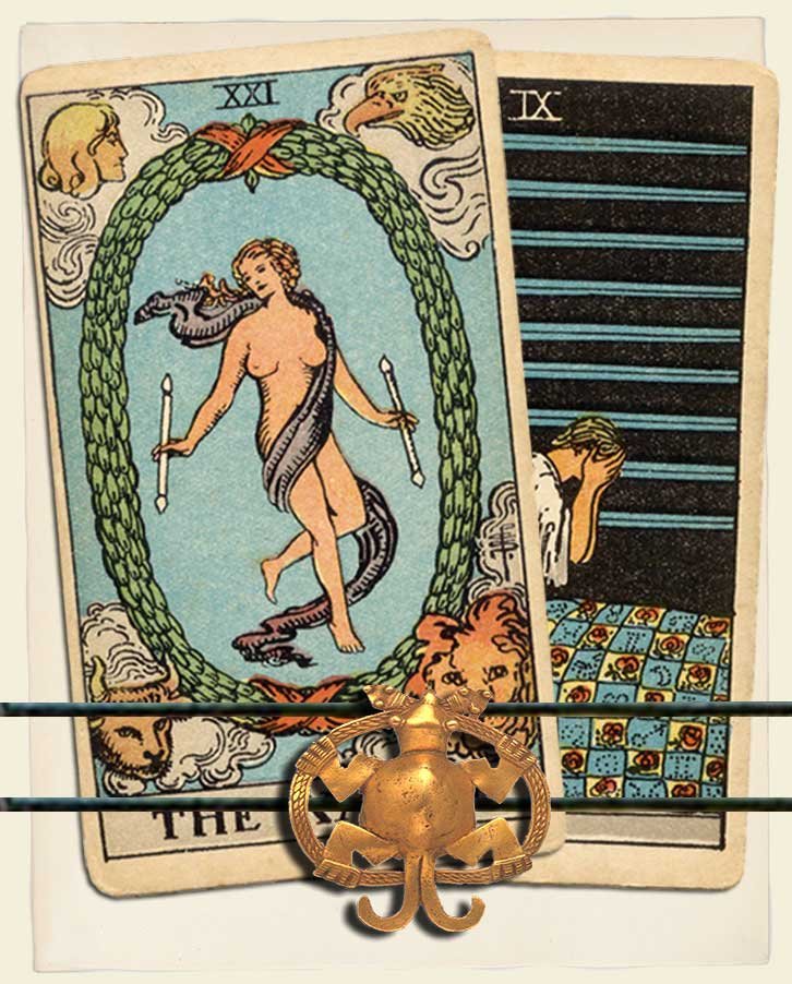 The World and Nine of swords together gives you a hint about your near future. It is influenced by the tarot forces of (I) INTEGRATION (from The World) and (II) BREAKING POINT. How to interpret this tarot combination in practice? To put it differently, it indicates that an emotion has been ignored causing it to grow out of proportion. Nothing should be left unattended, or it is only a matter of time before it breaks. Your emotional wardrobe should not be neglected, make it an integrated part of your routine to review it and mend it where it needs mending.