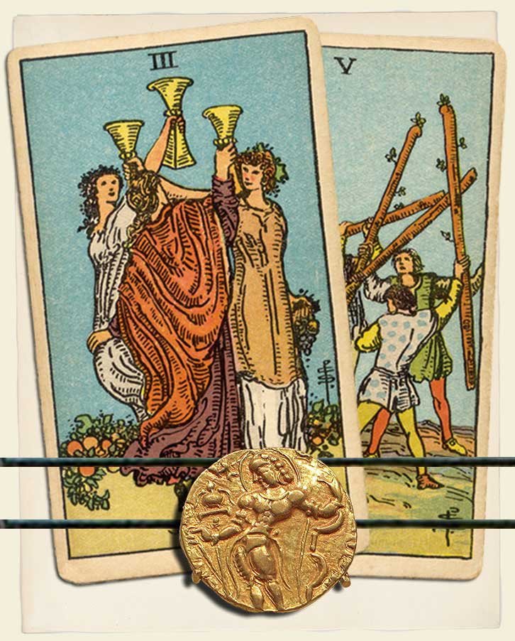 Three of cups and Five of wands tarot combination provides an insight into your current state and immediate future, which is influenced by the arcane forces of (A) GATHERINGS and (B) CONFLICT. You may gather with new people soon that don’t share your social/emotional background, and this may lead to some communication problems. Keep an open mind. Everyone is here to celebrate, so don’t let minor issues get in the way. These differences really can be overcome quite easily. Ask questions, listen to the answers, and enjoy one another’s company. It really is that easy.