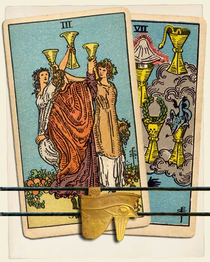 - Unfortunately though my darlings ,the Seven of Cups influence isn’t as rosy as our previous one…This card symbolises wishful thinking and fantasy which can lead us astray in romantic pursuits. It asks us to tread carefully with several decisions which lay ahead – traditionally associated with choosing between more than one lover *gasp*. Sadly though friends cheating could be indicated here so use your intuition wisely in romantic affairs.. As grandma used to say “all that glitters ain’t gold”.