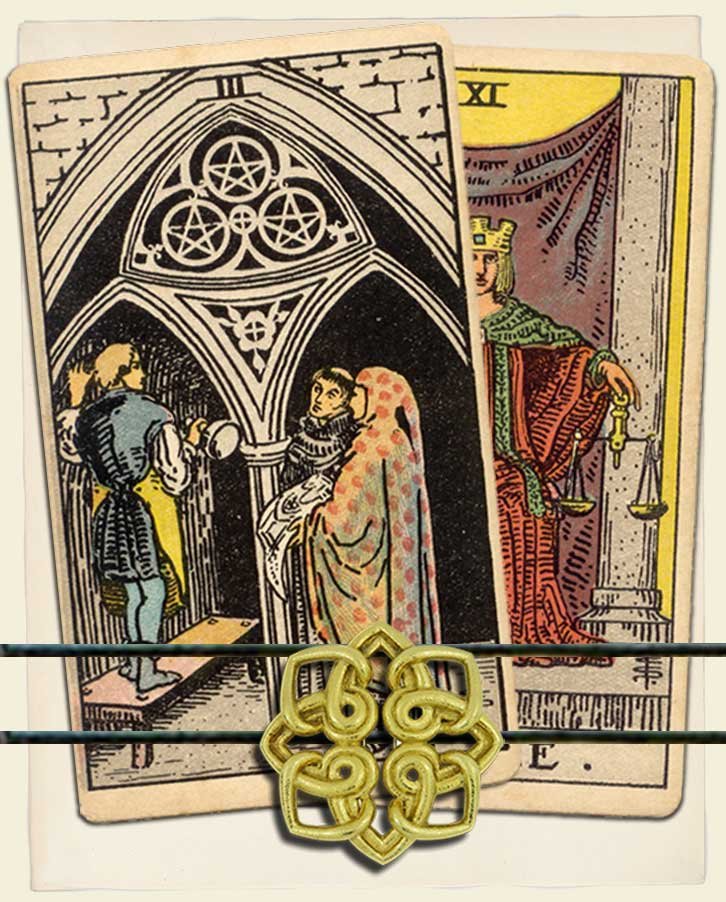 Three of pentacles and Justice combination means that two forces: 1) TEAMWORK and 2) LAW govern your life decisions today. What’s the advice of this pair? The Three of pentacles represents working in a team to build something lasting on a solid foundation. This is an energy of collaboration that requires a cooperative spirit. The presence of the Justice cards indicates that there is a wrong that needs to be corrected. Something unfair has happened, and the team you’re working on may have lost some of the trust required to work effectively. Employ a fair process to weigh all sides, and do your best to reach a just outcome, so your work can continue in an environment of trust.