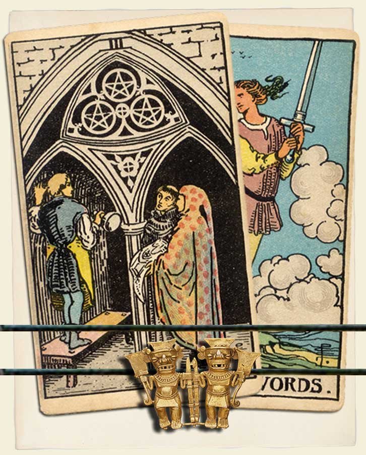 Three of Pentacles and Page of Swords combo interpretation