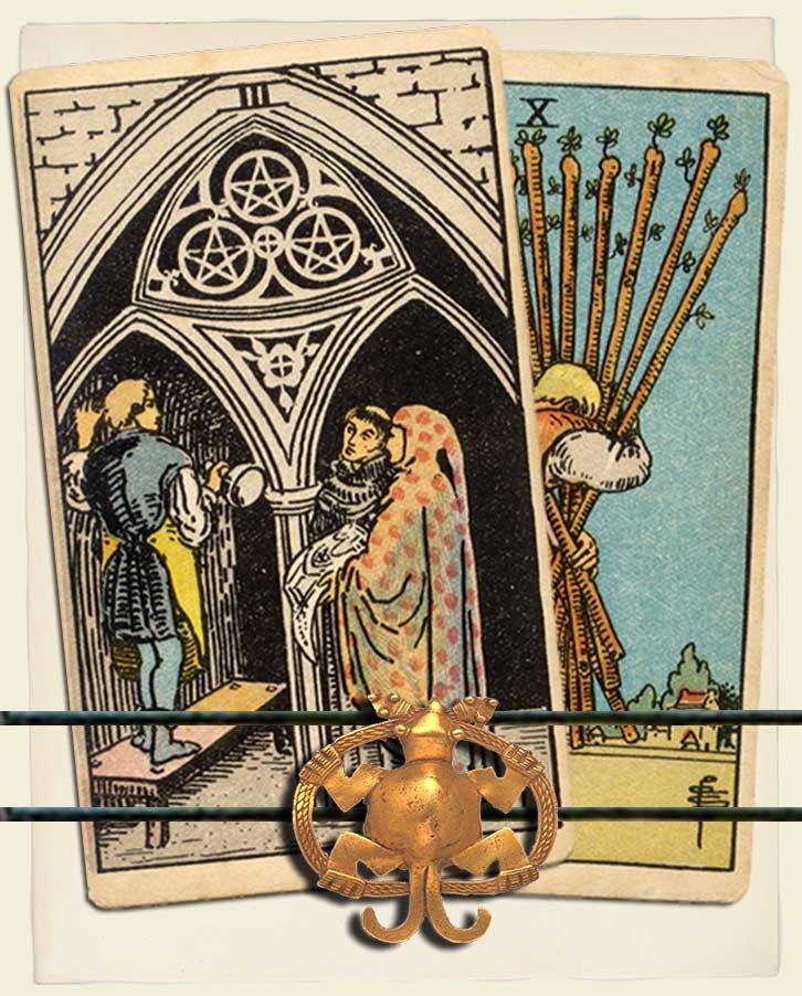 Three of pentacles and Ten of wands combination means that two tarot influences: 1) Pooling Energy and 2) Stress have influence on you at this moment. If you don’t stop hesitating, your opportunity will be lost. You have been foolish enough to wait this long – and, somewhere inside, you already know this. The tension you are feeling from your soul is bearing witness to your realization that it is high time for you to take advantage of this opportunity. You will soon realize it was the right thing to do.