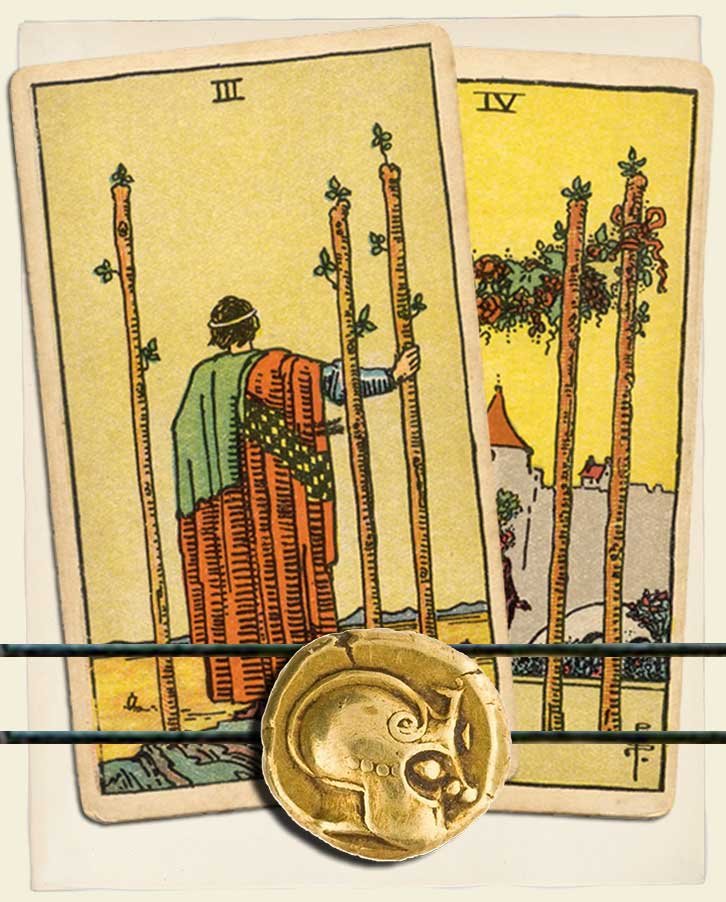 Greetings, young one. I see that you are seeking the wisdom of our ancestors regarding matters of love and relationships. Let me share with you the meaning of the Three of Wands and Four of Wands combination in tarot.