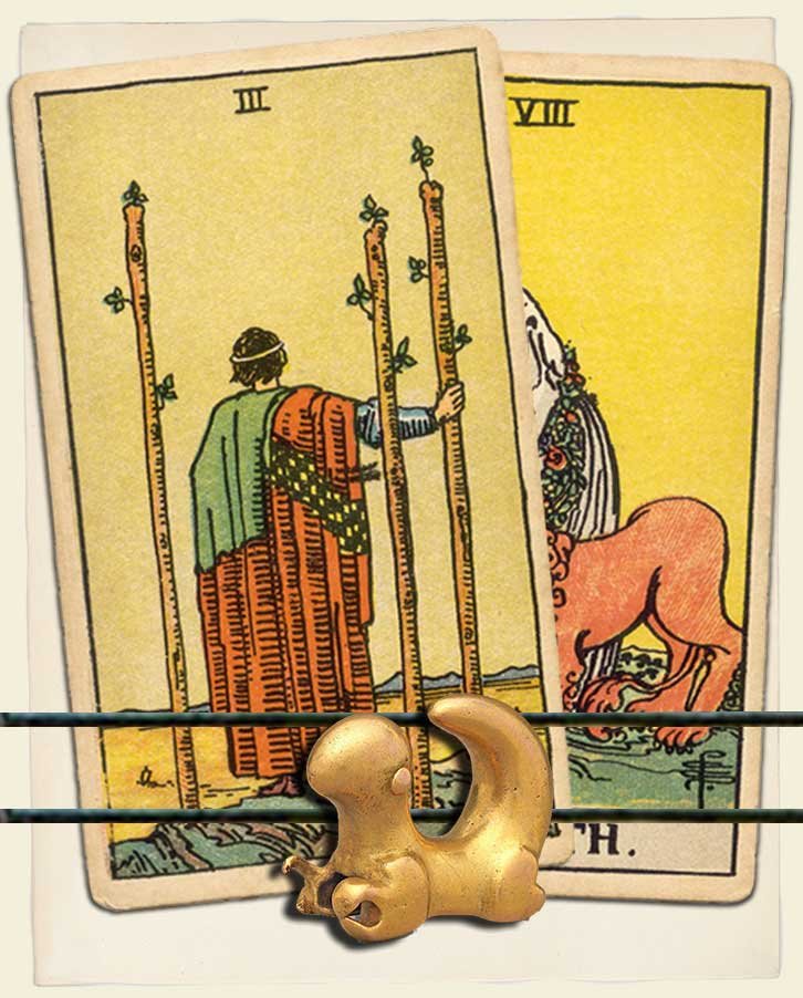 Three of wands and Strength combination is an omen that two forces: 1) Momentum and 2) Confidence are altering your life path today. You have been working hard on something, but it seems to be going nowhere. It may not even seem like you are making any progress at all, but don’t give up now. The Three of Wands indicates that there is a surge in your momentum right now that will carry you forward if you use it well. Don’t get too comfortable where you are at or the situation could stagnate again before things change for the better.