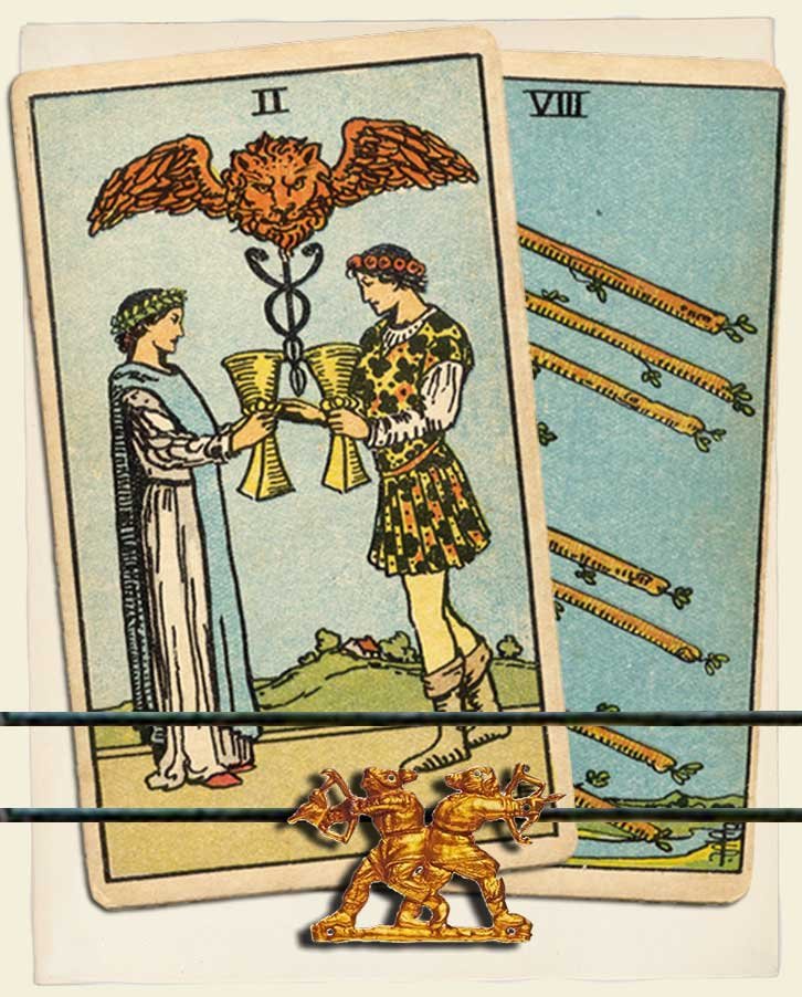 Two of cups and Eight of wands combination gives a glimpse into your near future. It will arise from the combined effect of: (I) PARTNERSHIP (arcane effect of Two of cups) and (II) SPEED (effect of Eight of wands). You have been waiting for this moment, but it is not quite ready yet. There are still some details to work out before you can celebrate, but don’t worry. The time will come soon enough as two powerful cards indicate that everything should fall into place at just the right time. Just hang on tight because things are about to move quickly now. This could be an exciting new beginning or maybe even a business deal that goes through successfully.