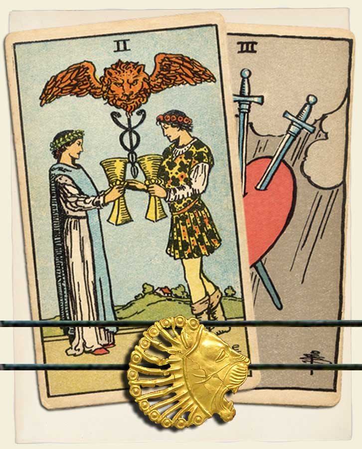 The combination of Two of cups and Three of swords is considered an undecided sign for love and relationships. It represents a clearer perception about an outcome in your future that is influenced by two arcane tarot forces – mutual attraction and hurt.
