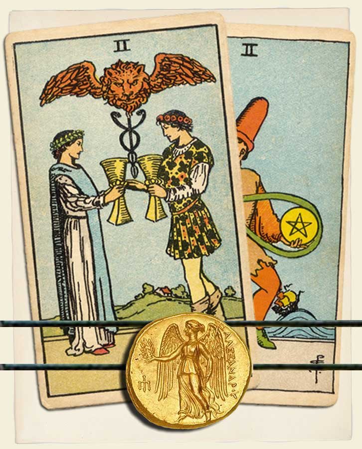 Well, now, let me tell you about the Two of Cups and Two of Pentacles in love and relationships. This combination is a good thing overall, but it does have its ups and downs.
