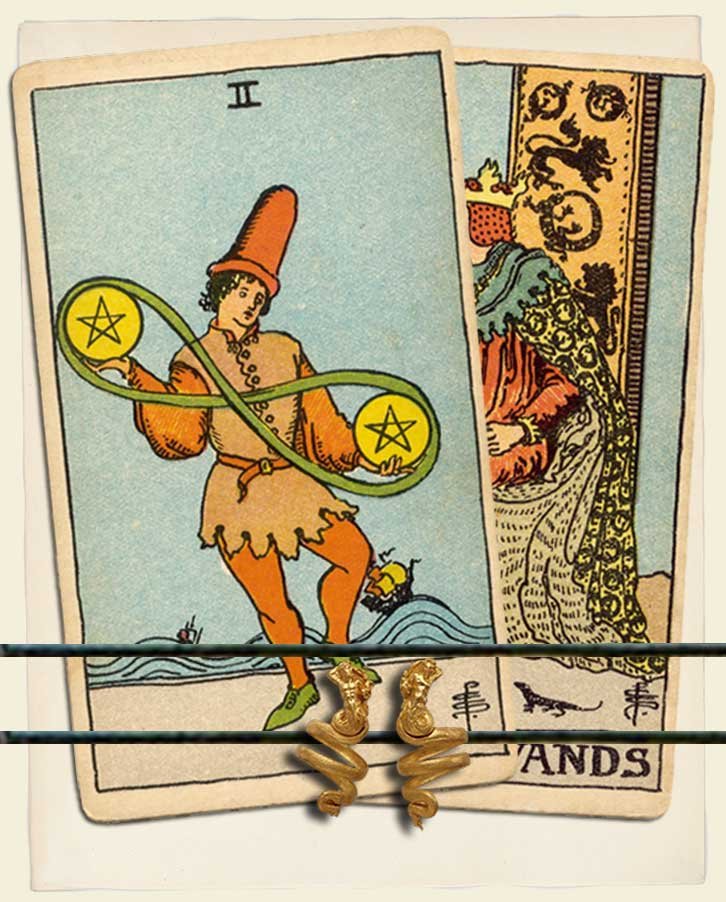 Two of pentacles and King of wands together provides an insight into a significant event in your future. It is influenced by the arcane forces of (1) stretching resources and (2) honor. To put it differently, it gives you a sign that someone may be in dire need of help specifically from you. Pay attention to who needs your help. When you make yourself available to help others and the pleasure you will gain from this will be an absolute honor.