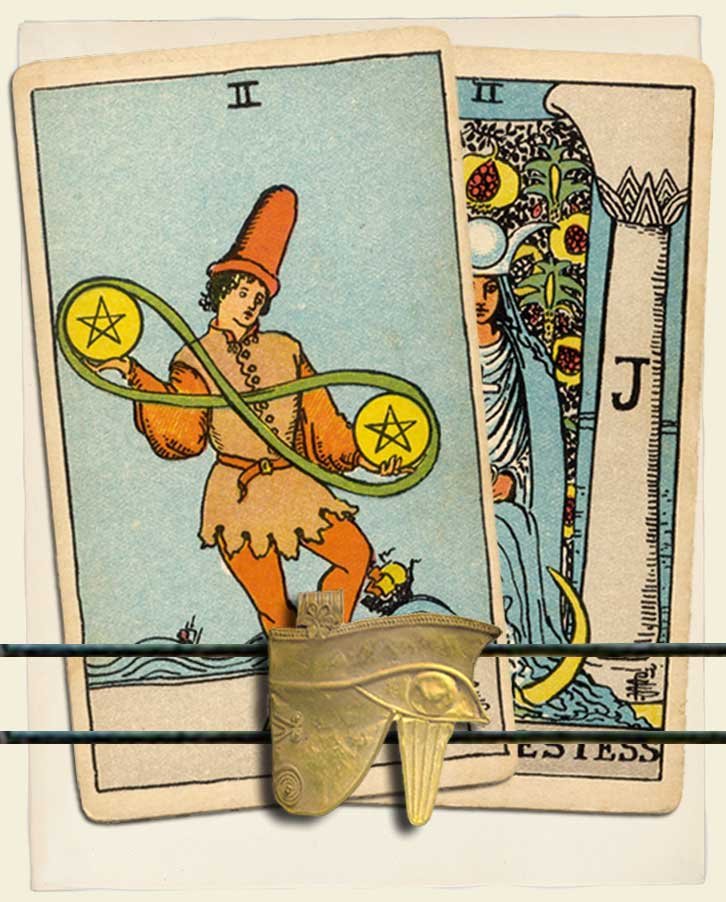 The pairing of Two of pentacles and The High Priestess indicates that two tarot influences, namely Stretching Resources (Two of Pentacles) and Intuition (High Priestess) govern your life decisions today. What does this card combination mean for you in practice? Most tarot readers would consider this a sign of divided attention. As the young man on the card, you too, are juggling several responsibilities, lifestyles, opinions or pursuits. With focus, it is possible to continue walking the tightrope. The High Priestess guides and cautions you, however. Listen to your heart to make sure the delicate balance is maintained. Also, be aware of signs which may signal the end of the current situation.