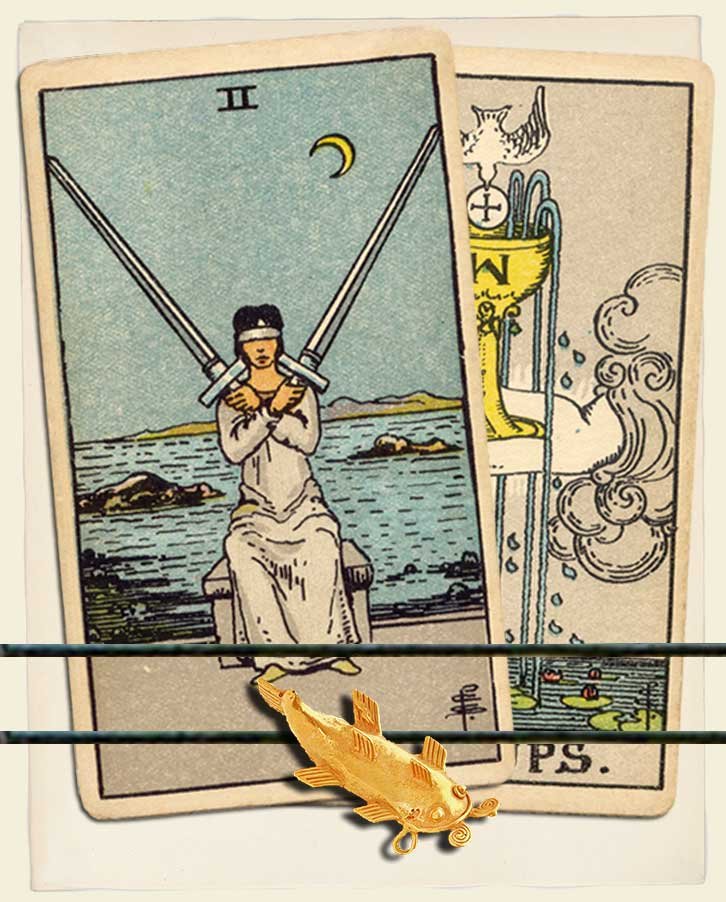 Two of swords and Ace of cups together is a sign that mystic tarot forces: (1) Weighing Up Options and (2) Love (influence of Ace of cups) guide your life decisions today. In other words, it means you will soon be called on to make a tough decision about a relationship. Think of it this way: up until now, you’ve been completely inebriated by this person’s love. Well, you’re starting to sober up. The question is, how will you act now that you have a sense of who they truly are? Renounce them, or continue to indulge in the comforting warmth of their embrace? Ultimately, that’s up to you.
