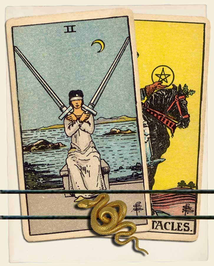 Two of swords and Knight of pentacles combination means that arcane tarot forces: 1) Stuck In The Middle (influence of Two of swords) and 2) Slow And Steady (influence of Knight of pentacles) are affecting you in this card reading. What’s the advice of this pair? You may be caught in a situation where there is no clear right or wrong answer, but it seems like something needs to change. The Two of swords indicates that there is conflict present, usually involving dishonesty. This card often represents being stuck in an uncomfortable position with no way out. It can feel as if you have nowhere to go and nothing left to give. The presence of the slow-moving energy represented by the King of pentacles indicates that your patience will pay off eventually, even if it takes some time for things to improve fully.