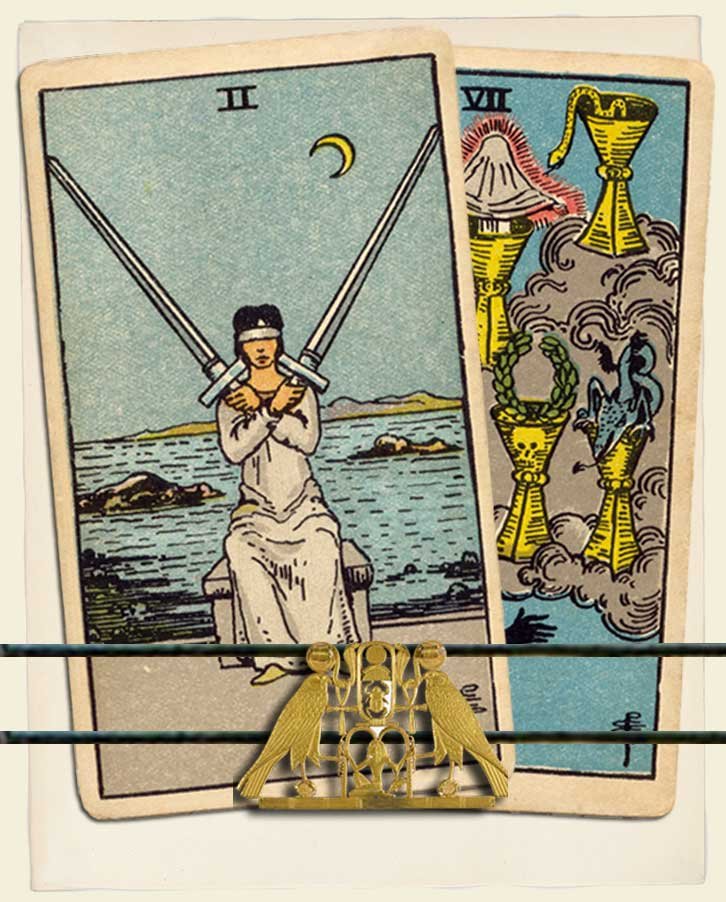 Two of swords and Seven of cups combination gives a glimpse into your immediate future. It is influenced by the arcane forces of (A) DIFFICULT DECISIONS and (B) DAYDREAMING. Think of it this way: if you want to progress you will soon have to break free of old illusions. Let’s be honest, you’ve known it for some time. True, there’re good reason for your retreat into fantasy—the real world is a scary place, after all. Still, if you are to grow, move on you must. So, start today. Splash some cold water on your face: wake up to your own life at last.