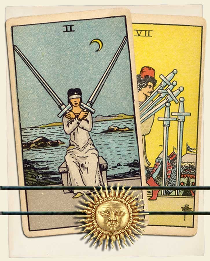 Well, now, this here combination of the Two of swords and Seven of swords is a downright hideous sign for love and relationships. It’s like trying to choose between two bad options while someone’s lying to you on top of it all.