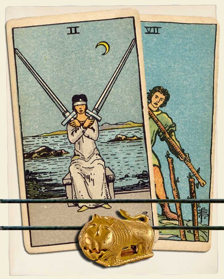 Two of swords and Seven of wands together gives a hint about a major event in your future, which is influenced by the arcane forces of DIFFICULT CHOICES and STANDING UP FOR YOURSELF. To put it differently, it indicates that you have been holding back, but then, that is because your adversaries have been holding back. That is the way it works with the Two of Swords, but when you see this card with the Seven of Wands, the tone of this particular disagreement is about to change. Something is about to happen, and it is not likely to be pleasant. You will most likely be feeling defensive and you will have a reason for it, too. Defend your ground if needed. You are in an excellent position. Stand up and be counted.