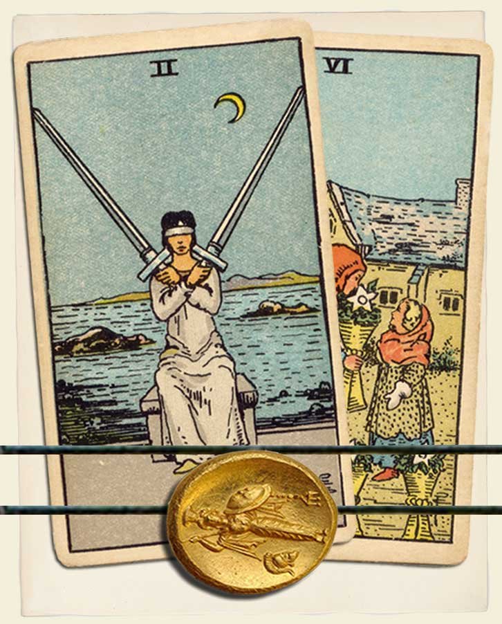 Two of swords and Six of cups tarot combination means that two tarot influences: 1) Stuck In The Middle (influence of Two of swords) and 2) Familiarity (influence of Six of cups) are influencing you at the moment. You are stuck in the middle of doing something risky and wanting instead to do something that is familiar to you. It is not time to be a sissy. You should take the risk and go for it. Your cards suggest that you may deeply regret not having enough courage to ditch your need to stay where you are comfortable and with things that are familiar to you.
