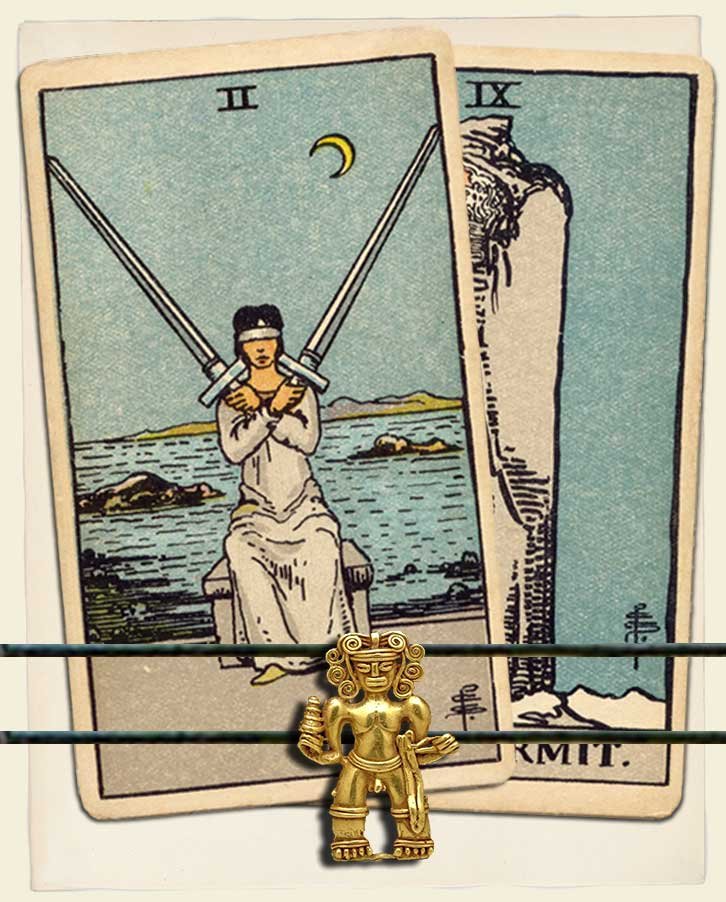 Two of swords and The Hermit combination means that two mystic forces: 1) Hidden Information (Two of swords) and 2) Inner Guidance (The Hermit) are altering your life path in this reading. If you haven’t taken the time to self-reflect lately, now is the time. In what ways have you been perpetuating your defenses in day-to-day life? Is there an inner truth you have been avoiding or have yet to surface? You may be making decisions from a place of fear or overwhelm. Whatever your latest focus has been, you are being called to renew your sense of purpose. Until you pause to reflect on your own satisfaction, you will continue to feel on guard and disconnected from your sense of self.