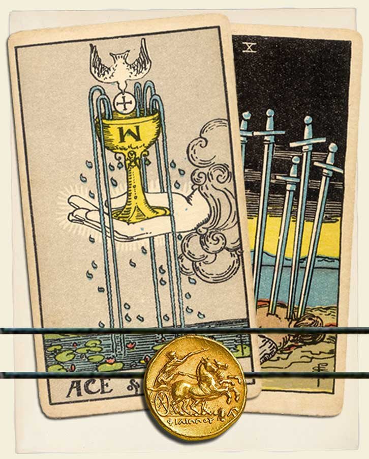 Ace of cups and Ten of swords tarot combination gives you an insight into your distant and barely discernible future. It will come to pass from the combined effect of (1) Compassion (effect of Ace of cups) and (2) Betrayal (effect of Ten of swords). What’s the advice of this pair? The Ace of cups represents a new beginning that allows people to share their feelings freely. This card indicates that there is something important in your life that needs to start flowing more freely, so it can grow healthy roots. The Ten o’ Swords represents deception and dishonesty – often as a result betrayal. Whatever change or growth you are trying to make won’t happen easily or without some bumps along the way. Be careful not to allow someone else’s negativity towards you to derail any good intentions you might have.