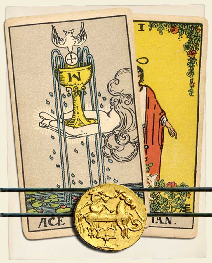 Ace of cups and The Magician combo means that arcane tarot forces: 1) LOVE and 2) MANIFESTATION are influencing you at the moment. It is almost as if you can see the bright light of creation shining down on you when the Ace of Cups meets the Magician. There is a rush of feelings, and this is no simple, fruitless note to the same three cords played over and over again. Your heartbeat drums out a symphony that you can share with others. All you must do is listen, and then create. The time is now, and if you let yourself, you can feel it.