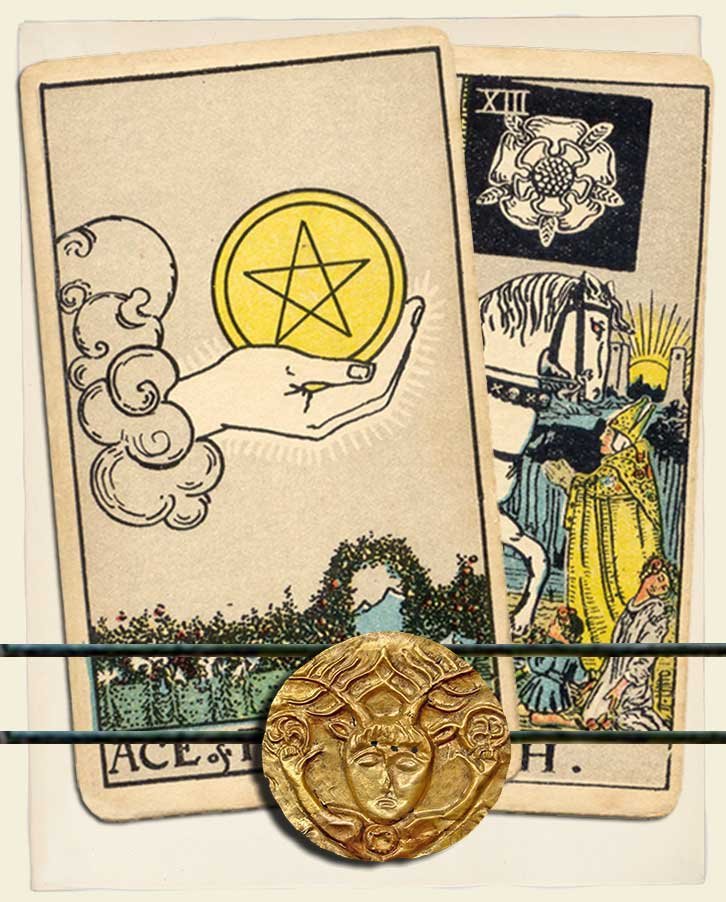 Ace of pentacles and Death combination means that two mystic forces: 1) Abundance and 2) Endings together are exerting influence on you. What’s the advice of this pair? The Ace of pentacles represents a stable new beginning after a period of abundance. This card indicates that you may have been waiting for things to calm down before making major changes in your life, because it is difficult to do so while living from paycheck to paycheck or having too much on your plate. If this describes you, take heart in the fact that now is a good time to make an important decision about what direction your future will take. The presence of the Death card indicates that whatever choice you make won’t be easy but will require some sacrifice. Be sure it’s the right one for you.