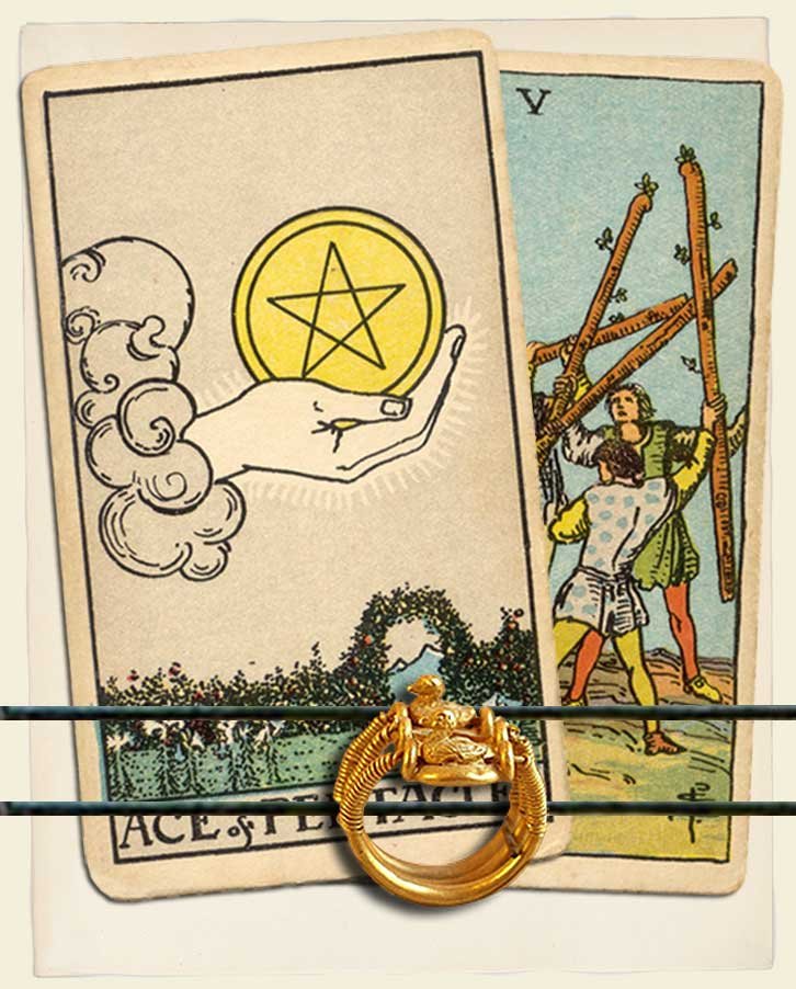 Ace of pentacles and Five of wands combination indicates that two tarot effects: I) Abundance (Ace of pentacles) and II) Diversity (Five of wands) currently guide your decisions. Most tarot readers would consider this to a blessing, because great things can come from an open mind and heart. The acceptance of outer events lead you to believe with all your soul that what is meant to be for you, will be. Lean on yourself as opposed to your closest friends, and understand that you have what it takes to create a life filled with all your most desired treasures.