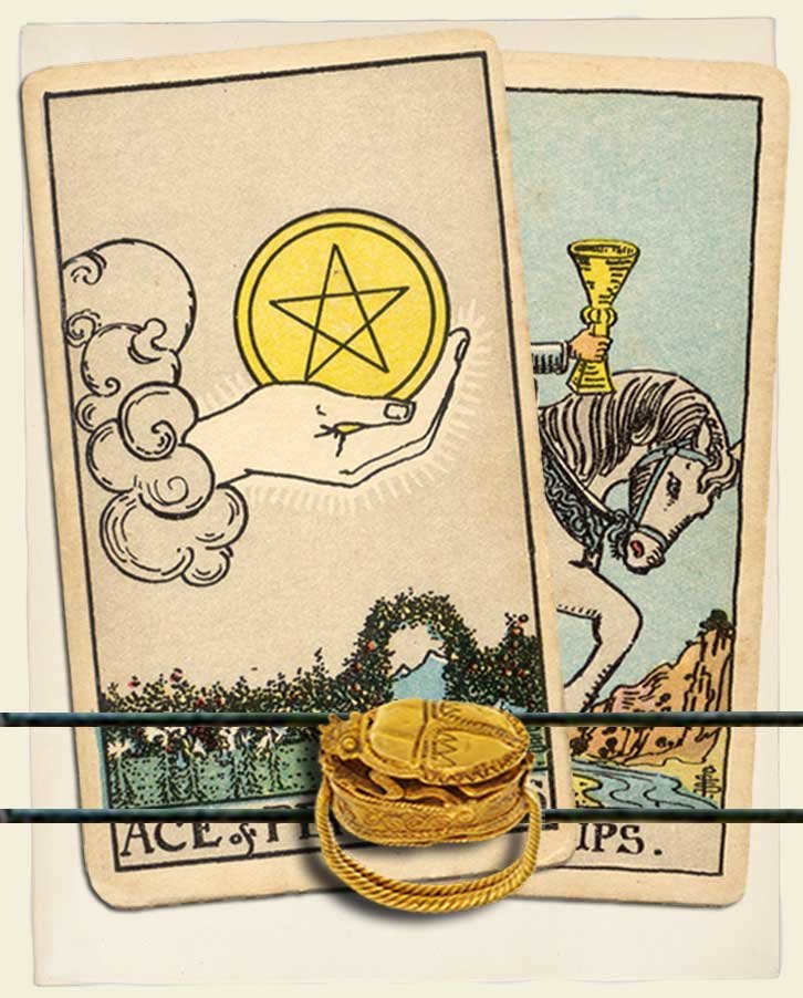 Ace of pentacles clarified by Knight of cups means that mystic tarot forces: 1) Stability and 2) Idealist have influence on you today. You can almost feel the sun shining down on you when the Ace of Pentacles comes with the Knight of Cups. Money finally falls into your lap and you can feel the rush of all your most cherished dreams. That new house, boat, or cell phone is finally within your reach, but hold on for just a minute there. Yes, the ace of this suit brings resources with it, and sometimes even the opportunity for more in the future, but that is in the future. Don‘t count your chickens before they hatch. Slow down. You’re getting there, just don‘t break the bank before you‘ve filled it.
