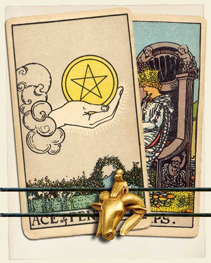 The Ace of Pentacles influences love moderately positively, indicating the down-payment on an engagement ring or new home with your sweetheart. However, be careful not to enslave yourself to the idea that you can own a good-looking mate. Your sanity depends on understanding that we cannot own our lovers.