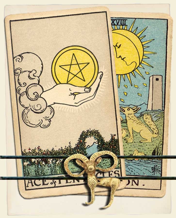 Ace of pentacles clarified by The Moon means that two tarot influences: (1) Resources and (2) Subconscious (influence of The Moon) govern your life decisions today. To put it differently, it indicates that a new beginning is on the horizon, and to let your intuition guide you as you enter this new cycle. The Ace of Pentacles presents new opportunities for growth and abundance, while the Moon calls for introspection and trust in one’s self. The cards remind you not to let your thoughts get the best of you at this time, and to maintain a positive outlook to better identify the opportunities that are presenting themselves to you at this time.