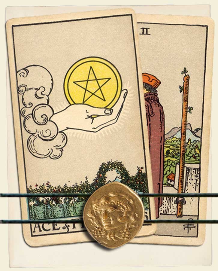 Ace of pentacles and Two of wands tarot combination is an omen that two mystic forces: A) Resources (Ace of pentacles) and B) Discovery (influence of Two of wands) guide your decisions today. With these influences in mind, now is a good time to plan and seek out the resources you’ll need for your next venture. This could have to do with your finances or career, which would both benefit from a careful consideration of your next steps forward. Even beyond these worldly goals, you are being asked to plan and organize your path before continuing onward.