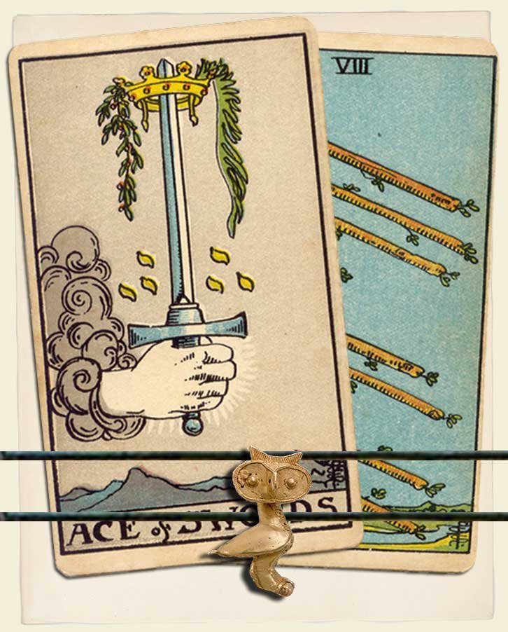Ace of swords and Eight of wands combination indicates that two forces: 1) Concentration and 2) Air Travel currently guide your decisions. In other words, it means that you may be traveling some distance to share your ideas. What’s the advice of this pair? The Ace of swords indicates that your mind is clear and sharp, and that you’re ready for a new challenge. If you’ve been trying to start or are working on a project, and you can’t quite get things off the ground, now is the right time to brainstorm how to get things moving forward. The Eight of wands (a card of communication and forward movement) indicates that you should also share your ideas and projects widely. They will pique people’s interest, and they’ll want to learn more. This will spark plenty of communication that might lead to a trip, perhaps to a conference or similar gathering.