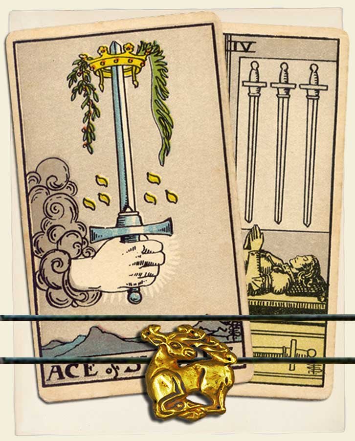Ace of swords and Four of swords together means that two tarot influences: 1) Breakthroughs (from the side of Ace of swords) and 2) Recuperation (from the side of Four of swords) are affecting your life path at this reading. A new relationship is waiting for you, but you’re afraid to open your doors for it. You know that not all people are the same, your fears are unfounded. If you give this love a chance, you will witness that the person in front of you embraces you and heals you with his love. Can you smell it? It’s the smell of love.