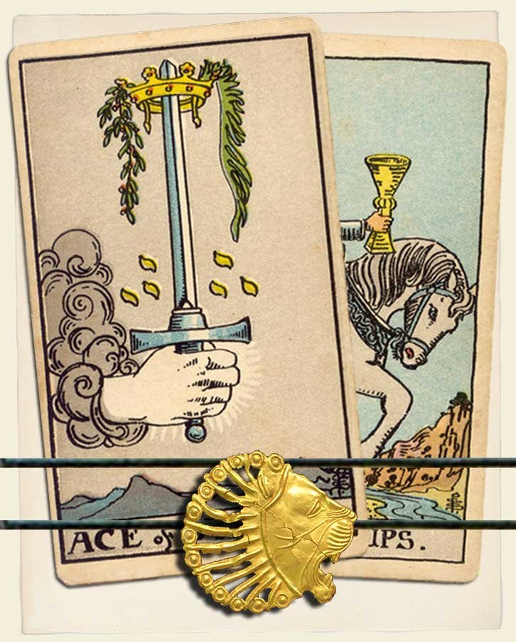 Ace of swords and Knight of cups together indicates that two forces: (1) CONCENTRATION and (2) ARTISTIC guide your life decisions today. In other words, it means you need all your strength and courage to deal with an impending troublesome situation. This will require concentration and determination. Once you pull yourself over that obstacle, a new artistic endeavor is indicated by this pair. You possess the idealism needed to see it through. There will be much cause for celebration at the end of it.