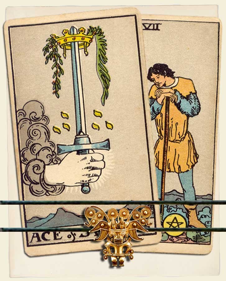 Ace of swords and Seven of pentacles combo gives you a better insight into an outcome in your future. It is influenced by the arcane tarot forces of (A) New Idea and (B) Perseverance. Powerful ideas meet an unmovable force within, when what could, or maybe even, should be, meets what is. This ace can be a powerful urge to change, but when it meets the Seven of Pentacles, what it encounters is everything you have already worked so hard to build. Maybe you are actually ready for a change, but before you get carried away, consider that there is more to this ace than just change. This ace is also a powerful force for defending what is already there, so it can shore up your already hard won harvest. It is up to you.